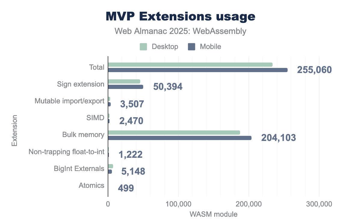 We find that Bulk Memory is the most widely adopted feature, appearing in 187,674 desktop and 204,103 mobile modules. This feature improves performance by allowing efficient copying and initialization of large memory blocks, mirroring the efficiency of the native memcpy function in C. Furthermore, Sign Extension—which provides operators for extending integer values (such as extending an 8-bit integer to 32-bit)—is the second most popular feature, found in 45,969 desktop and 50,394 mobile modules.