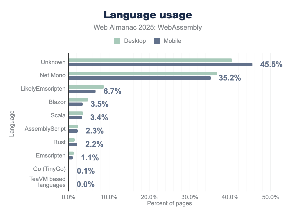 Among the identified languages, .NET/Mono + Blazor is the most common, holding a 41.7% share on desktop and 38.7% share on mobile. Although minified export/import names often obscure the source language, the Emscripten (C++) toolchain uses a distinctive naming convention. This allows us to attribute these modules with confidence, finding that Emscripten accounts for 10.1% of usage on desktop and 7.8% of usage on mobile, followed by Scala at 3.6%(on desktop) and 3.4%(on mobile) usage.