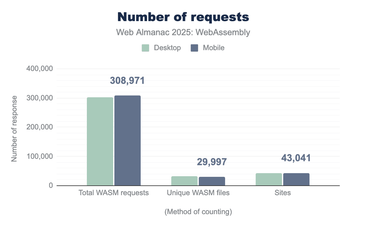 Overall, we recorded 303,496 WebAssembly requests on desktop and 308,971 on mobile. Although more desktop sites utilize WebAssembly, the total volume of requests is slightly higher on mobile.