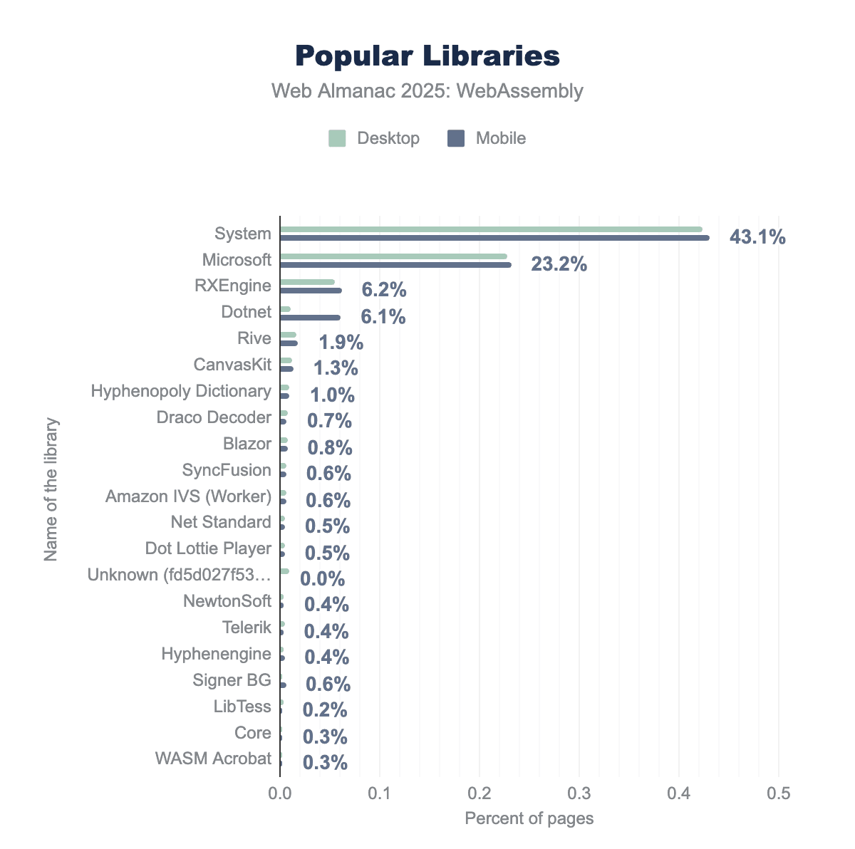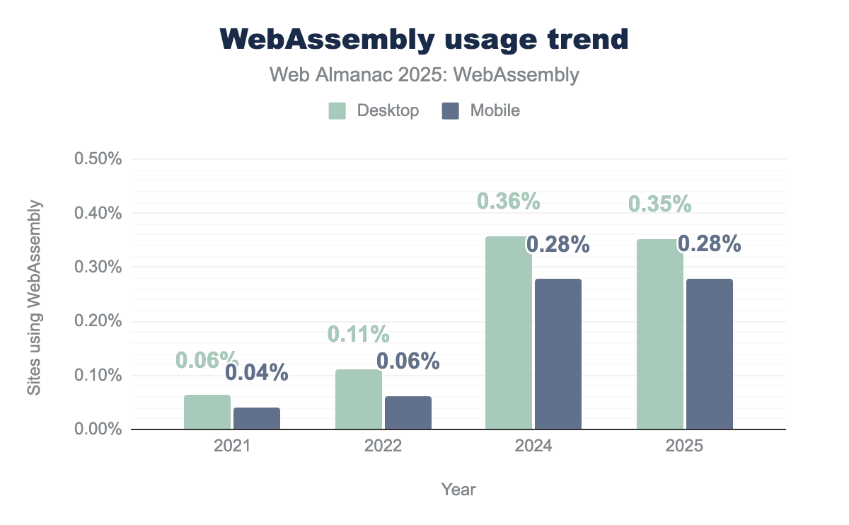 We find that WebAssembly adoption has grown from 0.04% in 2021, although rates have remained consistent over the last two years. In 2025, we found WebAssembly modules on 0.35% of desktop sites and 0.28% of mobile sites, representing approximately 43,000 sites. Furthermore, mobile adoption was lower than desktop adoption in all observed years, averaging a 30% difference.