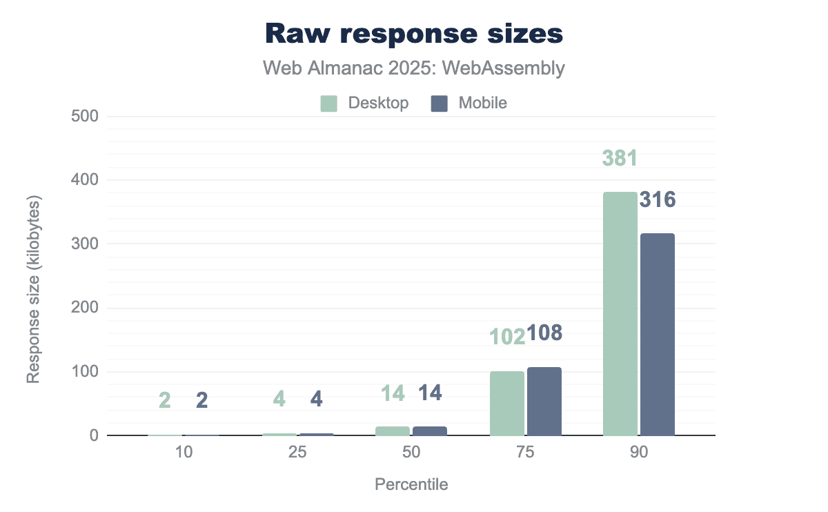Conversely, at the 90th percentile, sizes increase significantly to 381 KB on desktop and 316 KB on mobile. These larger binaries usually represent full desktop-grade applications ported to the web—such as Adobe Photoshop or Google Earth—compiled from heavier languages like C++ or C# to handle complex 3D rendering and logic.