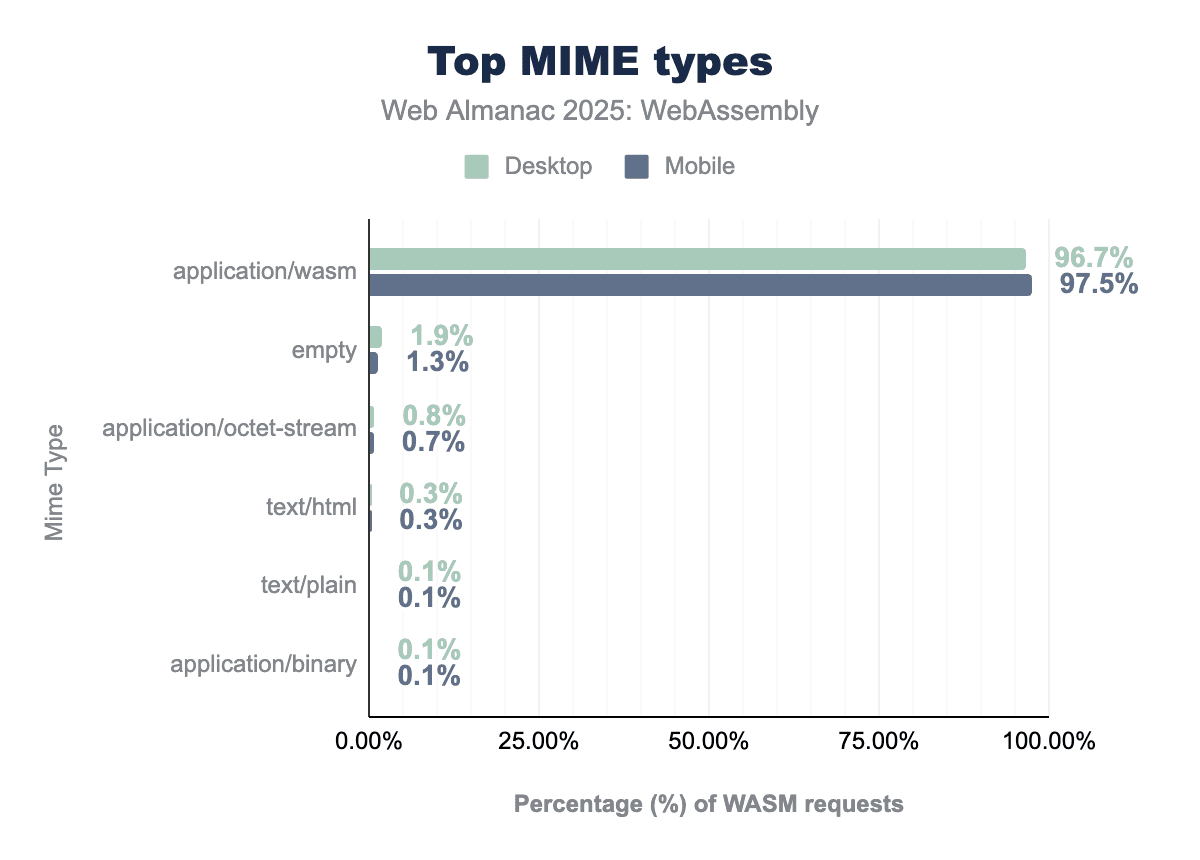 The application/wasm MIME type was identified in 293,470 desktop and 301,127 mobile requests. Instances of missing or incorrect MIME types (such as text/html or text/plain) were low, affecting 3.2% of desktop and 2.4% of mobile requests. These represent a significant decline compared to 2021, indicating improved awareness and adherence to proper server configuration.