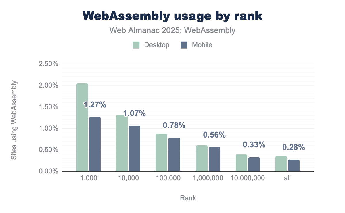 We see a strong correlation between site popularity and WebAssembly adoption. Usage is most concentrated among the top 1,000 websites, reaching 2% on desktop and 1.27% on mobile. These top-tier sites frequently host complex applications—such as design tools or heavy media editors—that require the high performance Wasm provides.
