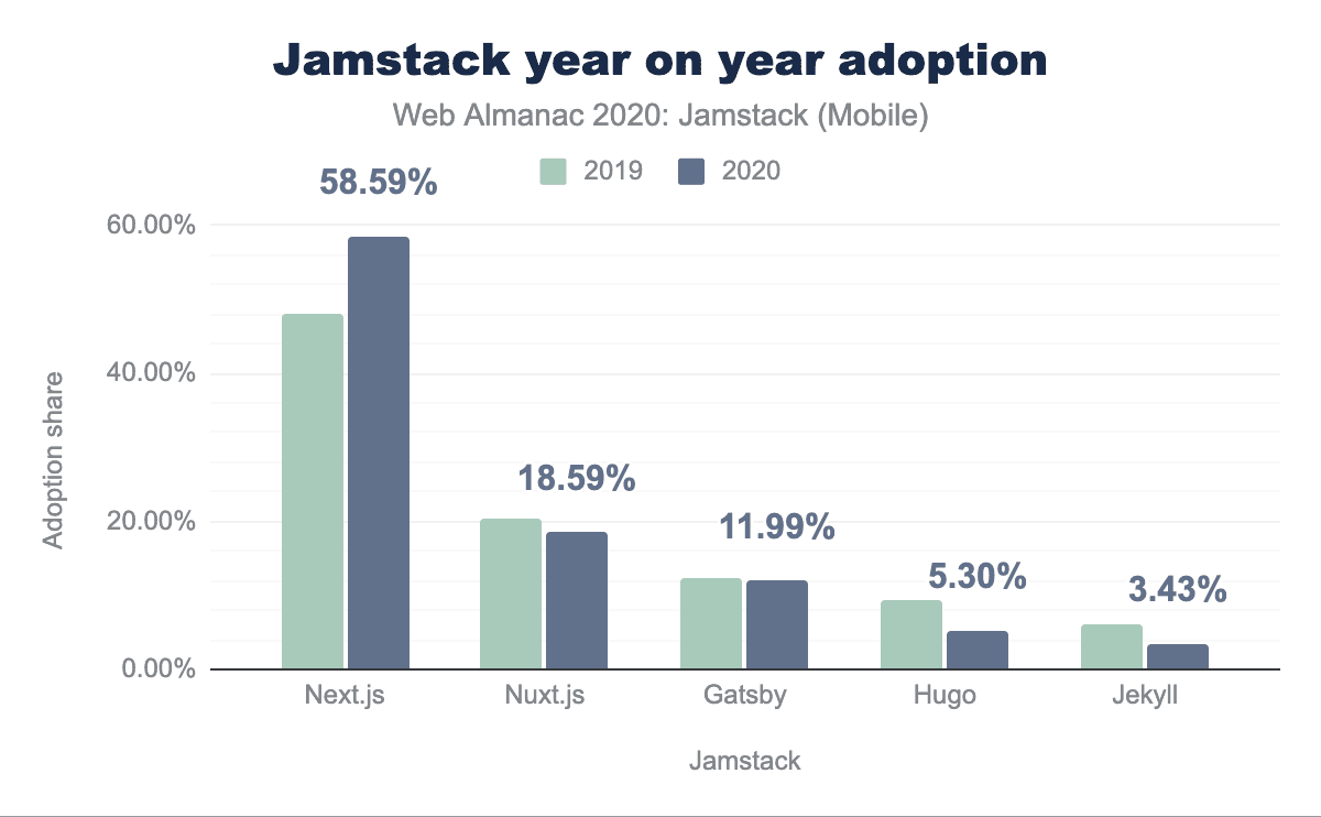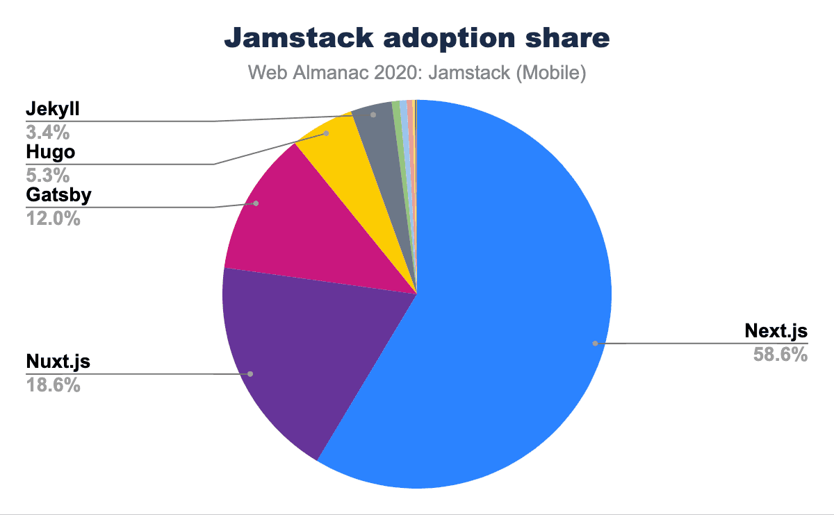 2020年には、Jamstackのシェアのほとんどが上位5つのフレームワークに分散しているようです。興味深いことに、Next.jsの利用シェアは58.65%です。これは、次に人気のあるJamstackフレームワークであるNuxt.jsのシェア18.6%の3倍以上です。