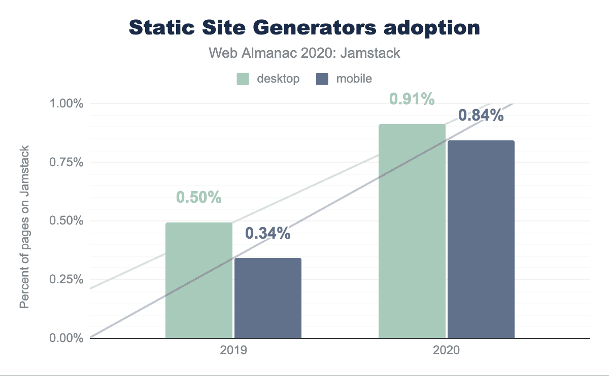 ウェブページの約0.9%がJamstackを利用しており、内訳はデスクトップで0.91%と2019年の0.50%から、モバイルで0.84%と2019年の0.34%から上昇しています。