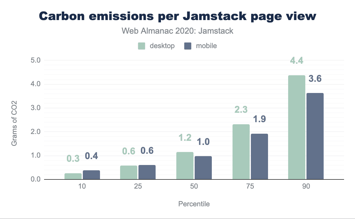 Jamstackのページロードの中央値は、デスクトップでは1.82MB、モバイルでは1.54MBのさまざまな資産を転送し、それぞれ1.2グラムと1.0グラムのCO2を排出していることがわかりました。Jamstackのウェブページの最も効率的なパーセンタイルでは、中央値よりも少なくとも3分の1のCO2排出量が少なくなりますが、Jamstackのウェブページの最も効率的でないパーセンタイルでは、逆に約4倍のCO2排出量になります。