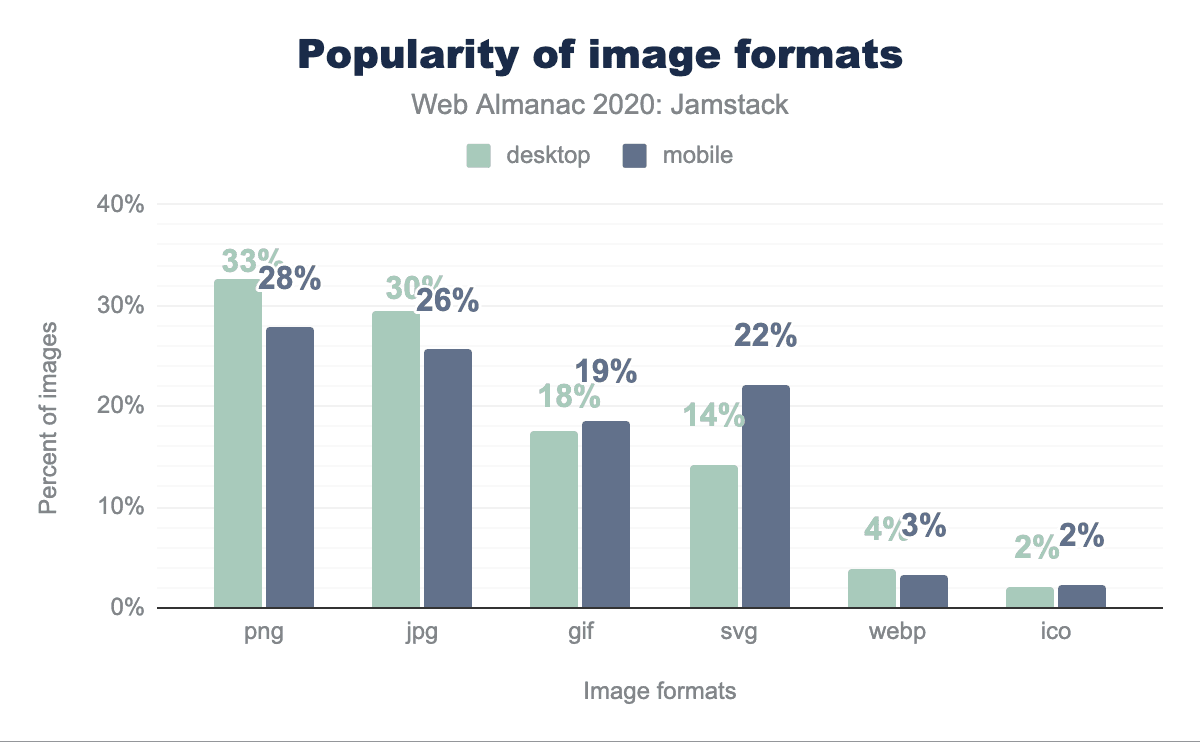 人気の画像フォーマットはPNG、JPG、GIF、SVG、WebP、ICOです。これらの中では、ほとんどの状況でWebPが最も効率的で、WebPの損失のない画像は同等のPNGよりも26%小さく、同等のJPGよりも25-34%小さくなっています。しかし、WebPはすべてのJamstackページで2番目に人気のない画像フォーマットですが、モバイルとデスクトップではPNGが最も人気があります。一方、JPGはわずかに人気がないのに対し、GIFはJamstackサイトで使用されている画像の20%近くを占めています。興味深いのはSVGで、モバイルサイトではデスクトップサイトの約2倍の人気があります。