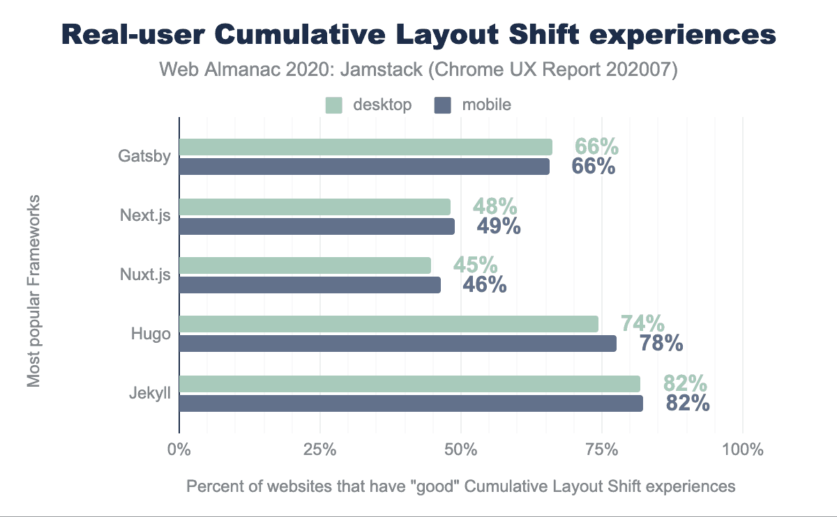 Jamstackフレームワークのトップ5は、ここでOKを出しています。トップ5のJamstackフレームワークで読み込まれたウェブページの約65%が「良い」CLS体験を持っており、モバイルでは82%まで上昇しています。デスクトップとモバイルの平均スコアは65%です。Next.jsとNuxt.jsはともに50%を下回っており、ここに課題があります。開発者を教育し、悪いCLSスコアを回避する方法を文書化することは、長い道のりを歩むことになります。