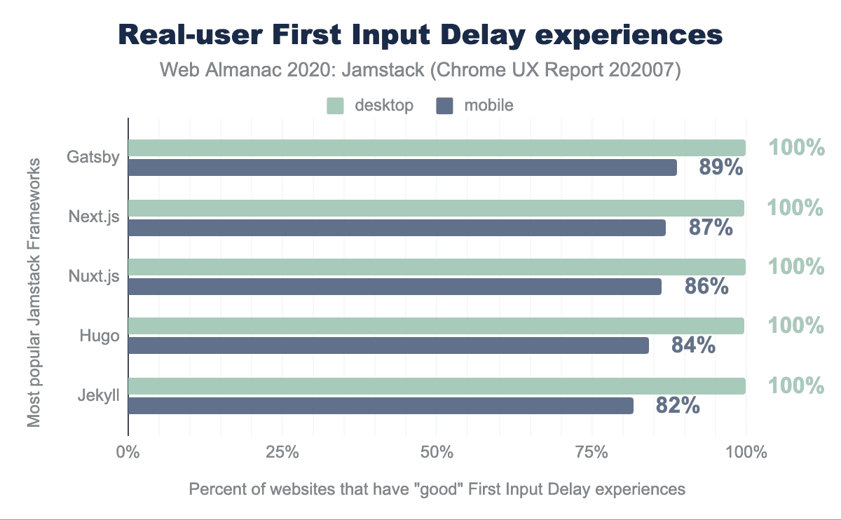 FIDは、デスクトップの平均的なJamstackのウェブサイトでは非常に速く、最も人気のあるフレームワークでは100%のスコアを獲得し、モバイルでは80%以上のスコアを獲得しています。