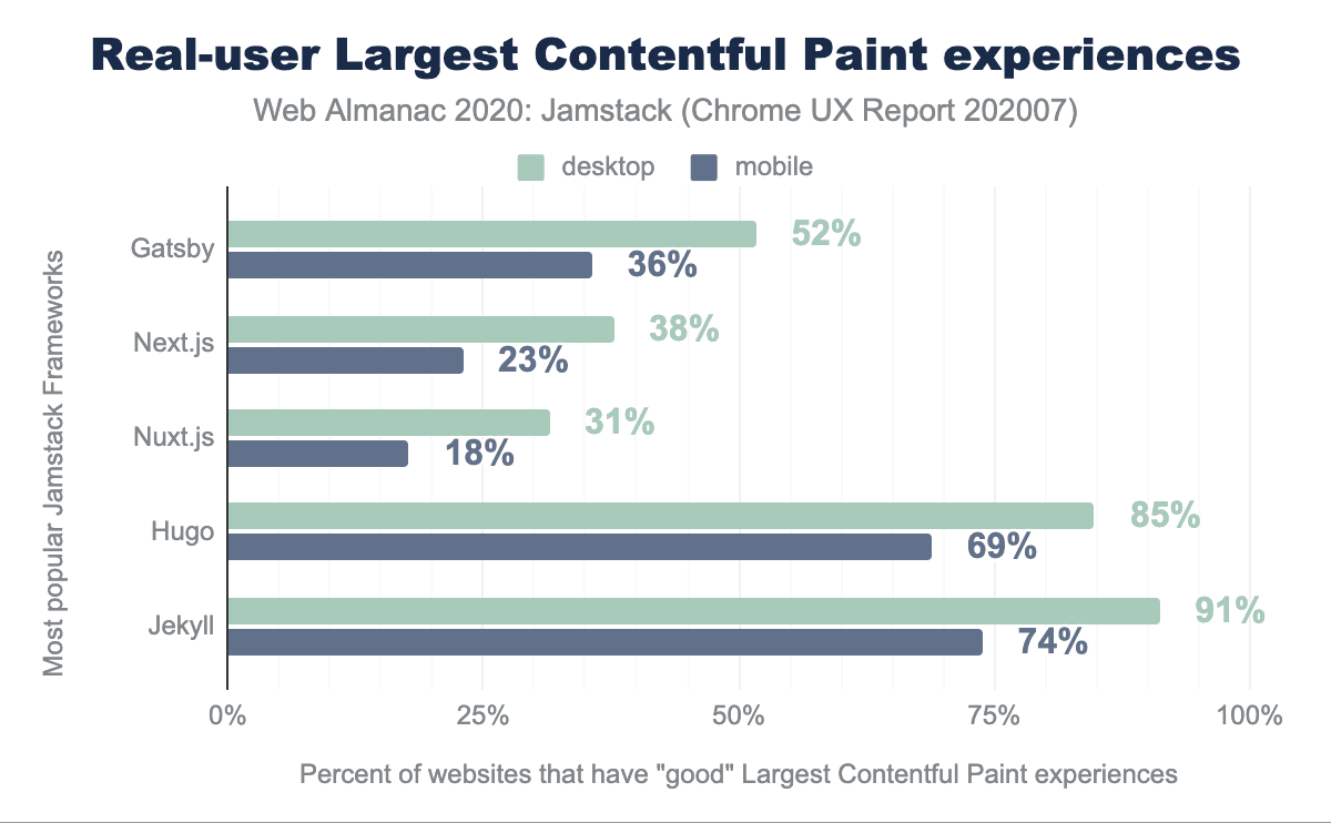 「良い」LCPは2.5秒以下とされています。JekyllとHugoのLCPスコアはいずれも50%を超えており、デスクトップではJekyllが91%、Hugoが85%と、印象的なスコアとなっています。Gatsby、Next.js、Nuxt.jsのサイトは遅れており、デスクトップではそれぞれ52%、38%、31%、モバイルでは36%、23%、18%となっています。