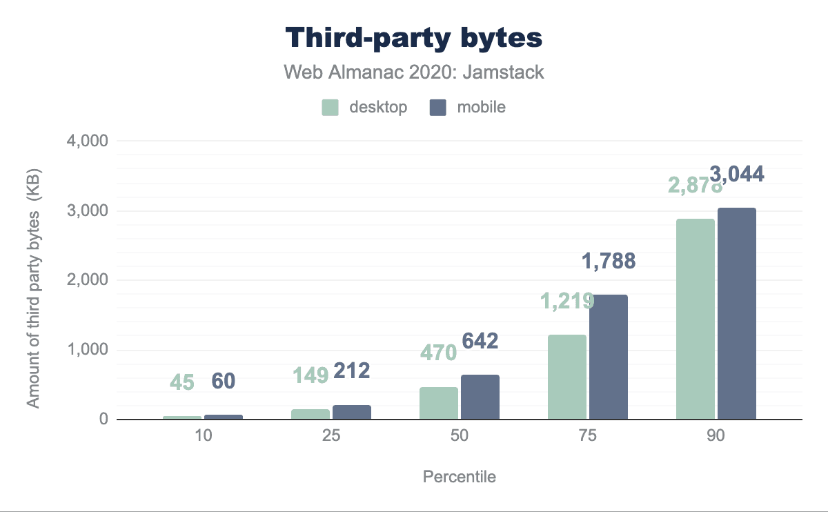 デスクトップのJamstackページの中央値では、サードパーティからのリクエストが26件、470 KBのコンテンツがあり、モバイルでは38件、642 KBのコンテンツが発生していることがわかりました。一方、デスクトップサイトの10%のサイトでは、2.88MBのコンテンツで114件のリクエストがありますが、モバイルでは3MBのコンテンツで148件のリクエストがあります。