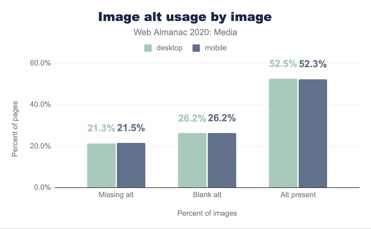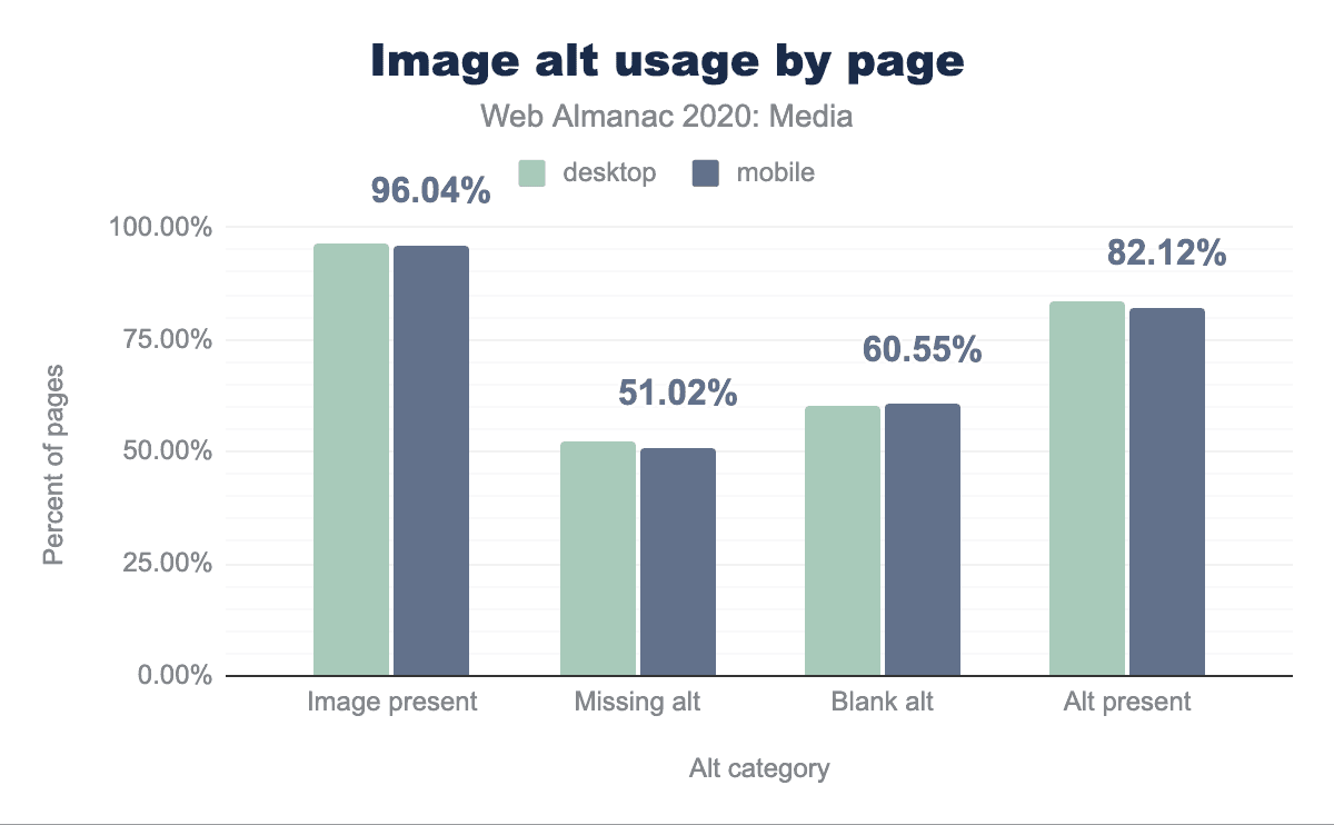 処理された全ページの約96%に<img>要素がありましたが、そのうち21%の画像にはalt属性がありませんでした。52% の画像にはalt属性がありましたが、そのうち26%は空白でした。簡単に言うと、ウェブ上の画像のうち、空白ではないalt属性を持つものは約4分の1しかなく、有用な説明文であるaltテキストを持つものはそれよりもさらに少ないと思われます。