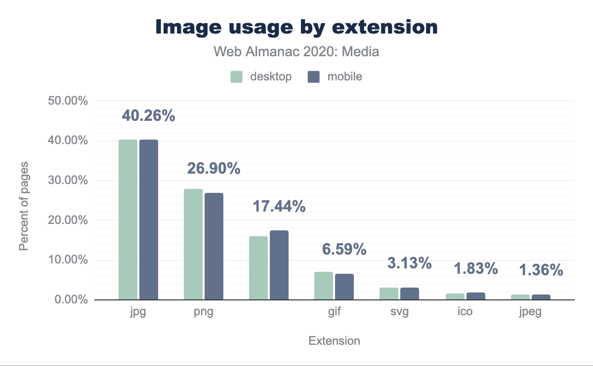 jpgで40.26%、次にpngで26.90%、続いて拡張子なしが17.44%、gifが6.59%、svgが3.13%、icoが1.83%、jpegが1.36%となっています。デスクトップも非常に似たような使い方をしています。たとえば、「.jpg」が「image/webp」というMIMEタイプで配信されるなど、拡張子とMIMEタイプの間にはさらに不整合が見られますが、これらのいくつかは、オンザフライでの変換や最適化機能を備えたImage CDN配信サービスに起因する自然現象であると考えられます。