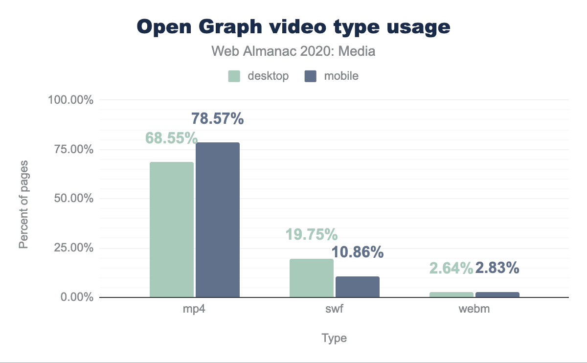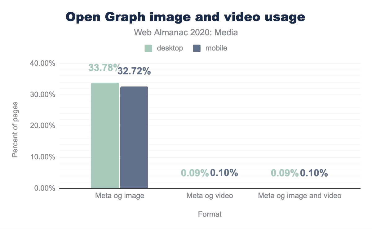ウェブページの3分の1は、マイクロブラウザ用のオープングラフタグで画像を含んでいます。しかし、マイクロブラウザ専用の動画を掲載しているページは全体の0.1%程度で、動画を掲載しているページのほとんどが画像も掲載しています。