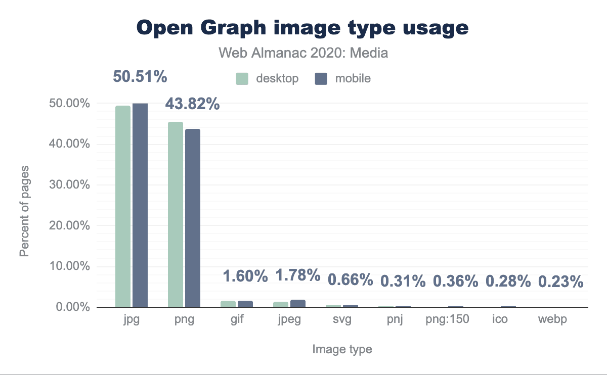 Open Graphプロトコルでは、画像や動画のURLは1つしか含めることができません。<picture>やsrcsetで提供されるようなコンテキストに応じた柔軟性はありません。そのため、作者はマイクロブラウザに送信するフォーマットを選ぶ際に、どちらかというと保守的になりがちです。マイクロブラウザ専用画像の半分はJPEG、45%はPNG、2%弱はGIFです。WebPは、マイクロブラウザ用画像の0.2%に過ぎません。