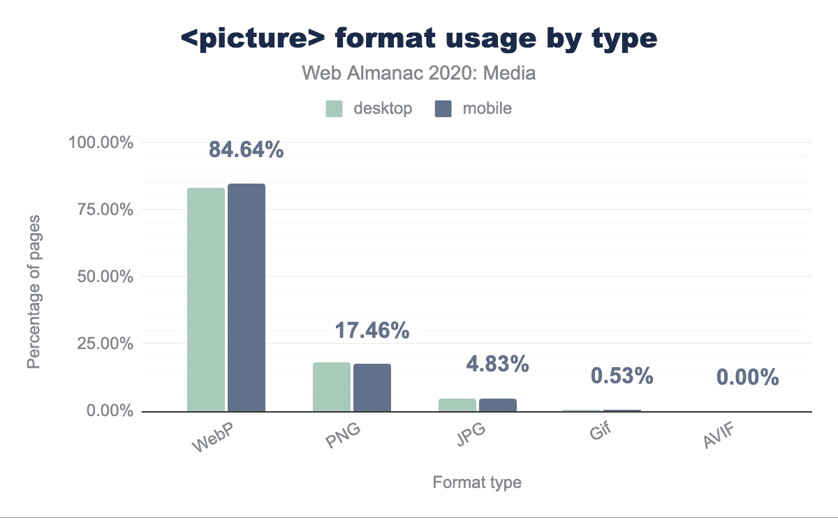 <picture>でフォーマットを切り替えているページのうち、83%がWebPをフォーマットのバリエーションの1つとして提供しており、ブラウザのサポートが拡大していることも関係しています。