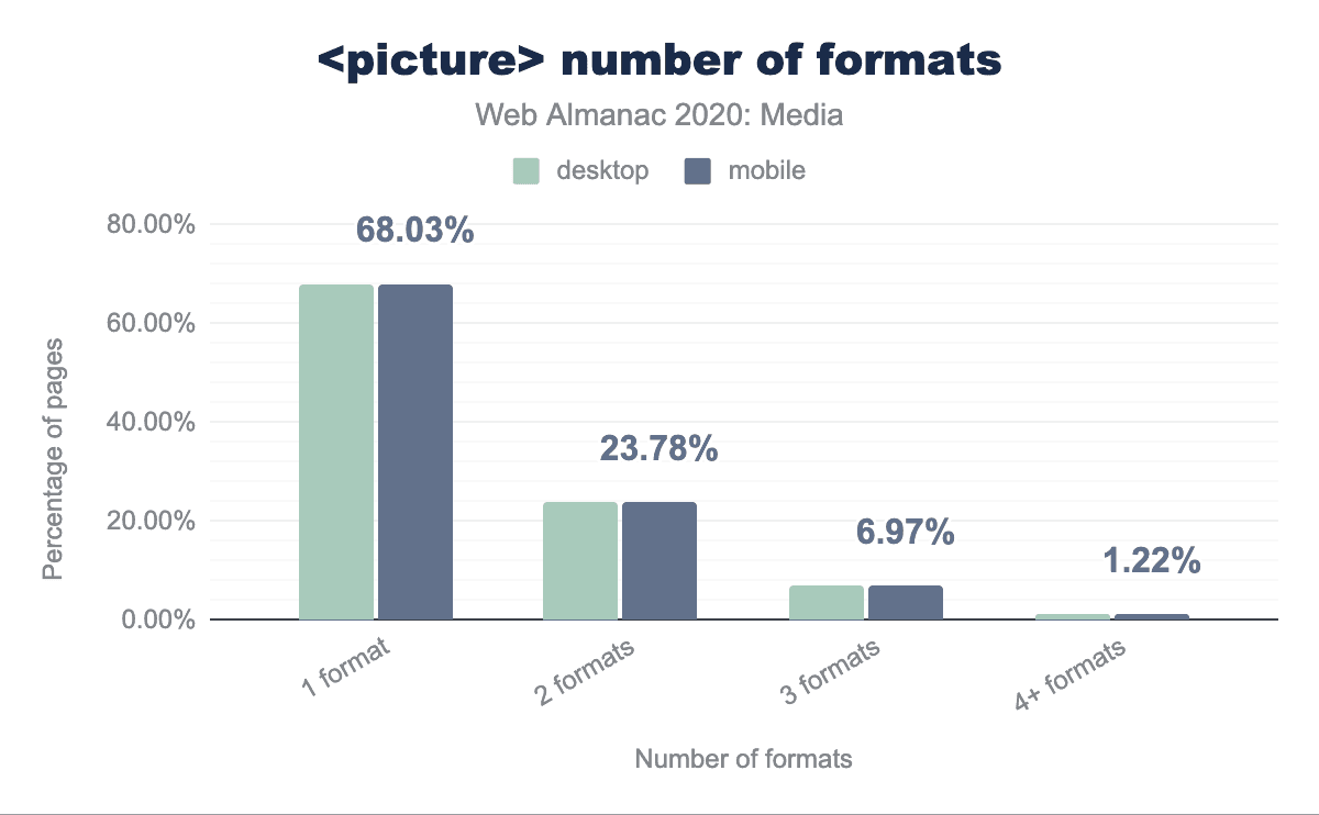 フォーマットの切り替えに<picture>を使用しているページのうち、約68%が、デフォルトとして機能する<img src>に加えて、単一のタイプのバリエーションを提供しています。