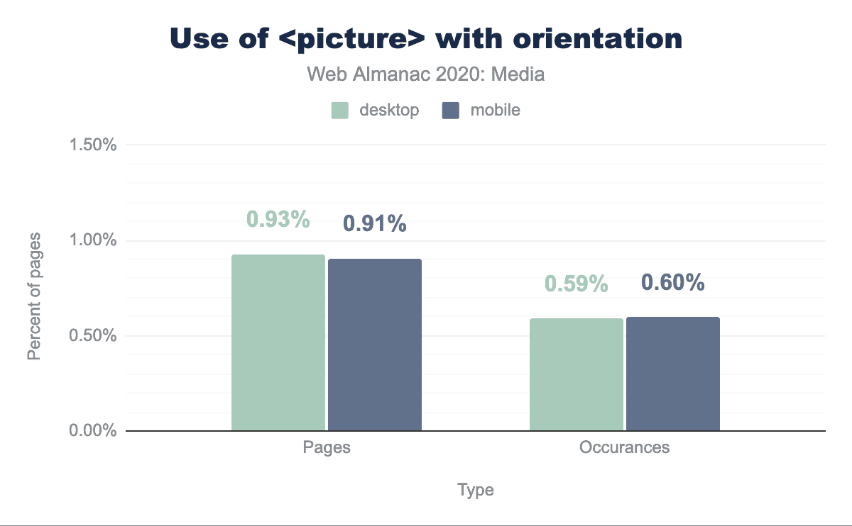 <picture>のを向きを変えて使用していることを示す棒グラフ。デスクトップで0.59%、モバイルでは0.60%の<picture>がオリエンテーションを使用しています。<picture>オリエンテーションの使用方法。