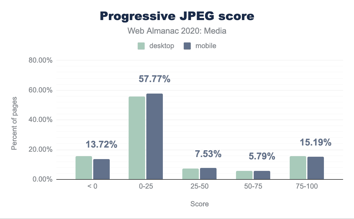 プログレッシブJPEGはどれくらい一般的ですか?WebPageTestでは、各ページに「スコア」を付けています。これは、プログレッシブ・エンコードされたJPEGから読み込まれたすべてのJPEGバイトを合計し、プログレッシブ・エンコードされる可能性があったJPEGバイトの合計数で割ったものです。大半(57%)のページでは、JPEGバイトの25%以下しかプログレッシブエンコードされていませんでした。これは、JPEGのプログレッシブ化が長年のベストプラクティスであり、MozJPEGのような最新のエンコーダーがデフォルトでプログレッシブにエンコードしているにもかかわらず、ダウンサイドのない圧縮節約のための大きなチャンスを示しています。