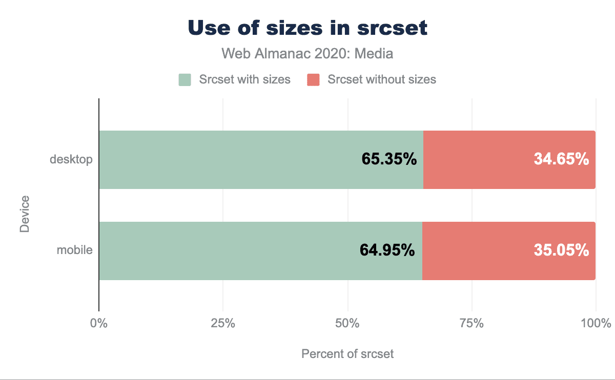 2020年のデータでは、srcsetを使用しているサイトの約35%がsizesと組み合わせていませんでした。ブラウザは喜んでsizes="100vw"のデフォルトに戻りますが、この属性をオフにしておくと、技術的に正しくありません。この見落としにより、もっとも適切な画像候補を決定する数学に欠陥があり、しばしば不必要に大きな画像がリクエストされてしまうケースが定期的に発生しています。
