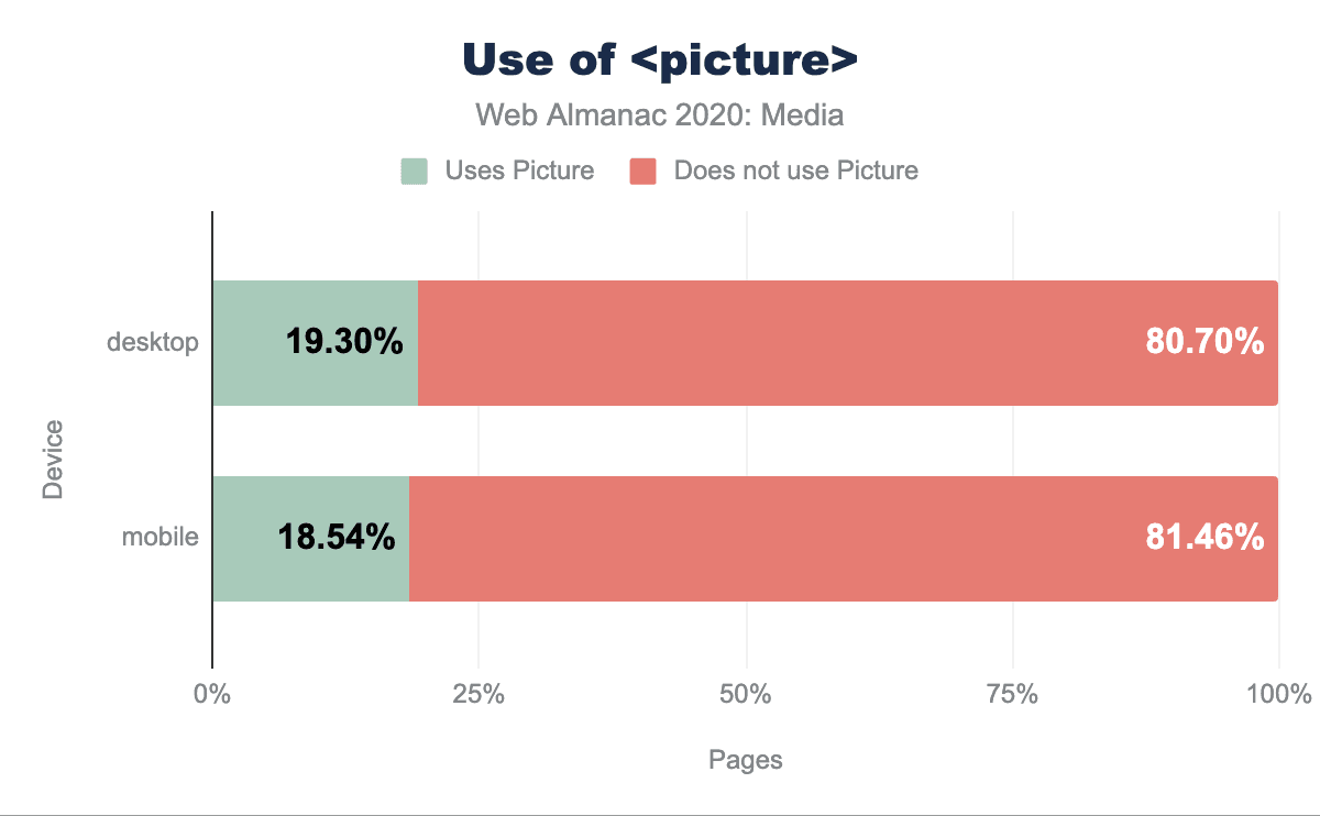 <picture>を使用しており、80.70%が使用していません。モバイルでも同じように、18.54%が使用し、81.46%が使用していません。<picture>の使用。