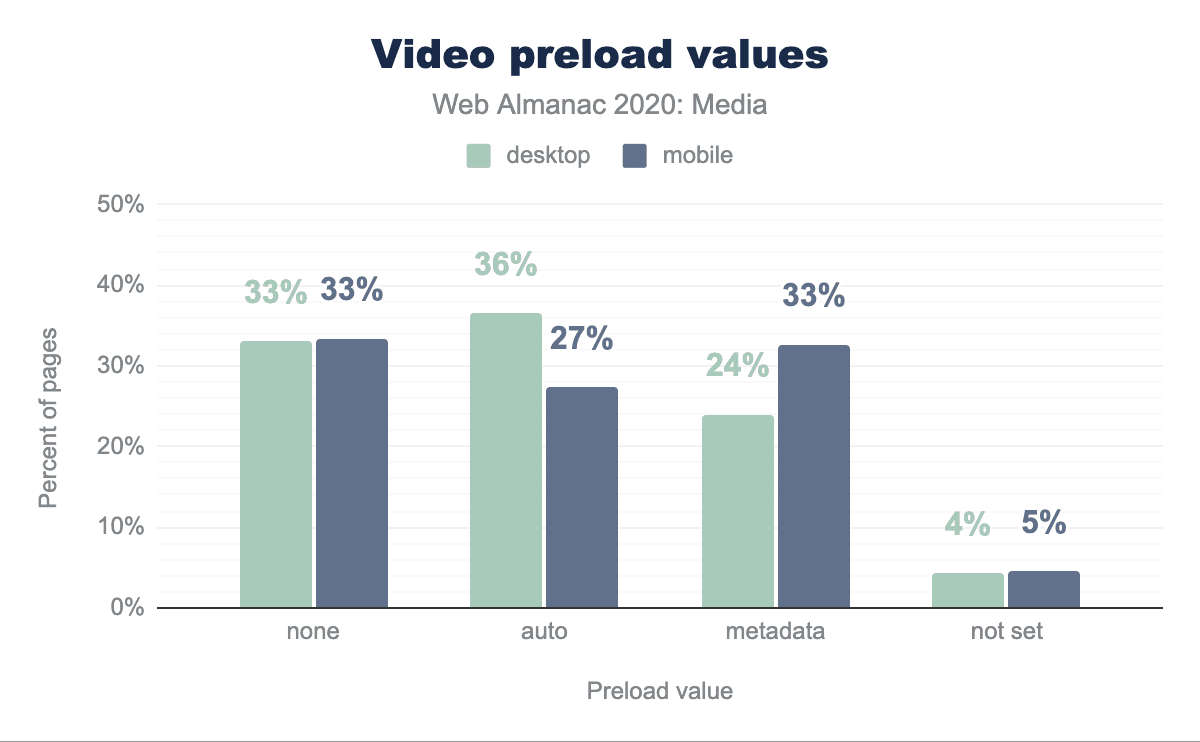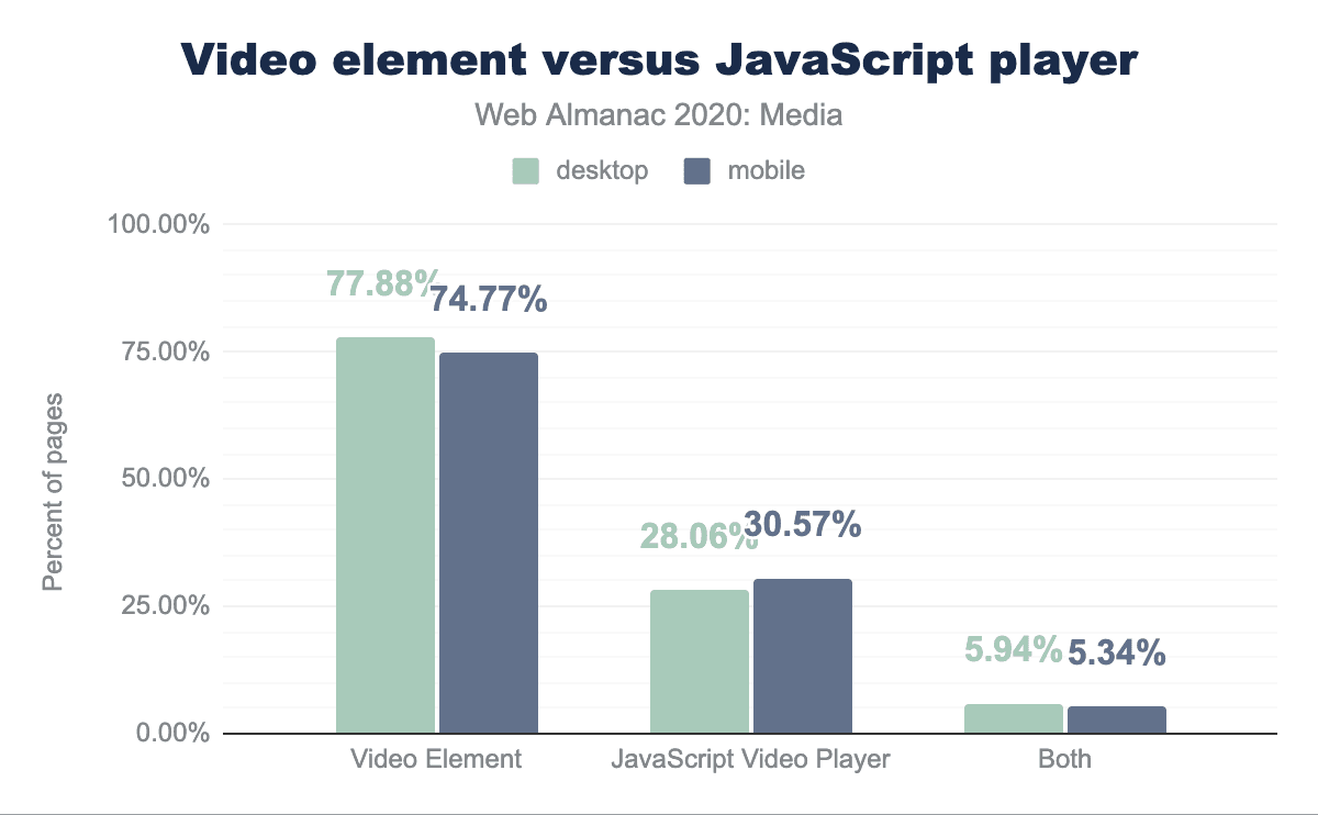 当然のことながら、もっとも一般的なタイプの値はvideo/mp4です。しかし、次に多いのは、デスクトップ用のタイプの15%、モバイル用クローラーに送信されるタイプの20%を占めるvideo/youtubeで、これは登録されたMIMEタイプではありません。これは、登録されたMIMEタイプではなく、(WordPressを含む)いくつかのプレイヤーがYouTubeの動画を埋め込む際に使用する特別な値です。さらに、Vimeoの埋め込みにも同様のパターンが見られます。