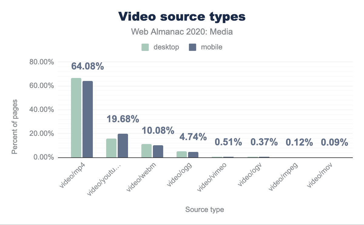 MP4とWebMは、一般的に使用されていると思われる唯一の2つのフォーマットです。これらのコンテナの中でどのコーデックが使われているのか、またVP8、HVEC、AV1などの次世代コーデックがどれだけ普及しているのかを知ることは興味深いことです。しかし、そのような分析は、残念ながらこの記事の範囲外である。