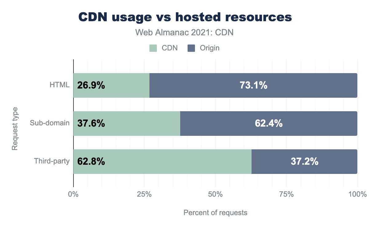 その影響は、2019年版の同データと比較すると、上のグラフのようにわかります(注、2020年版Web AlmanacにはCDNの章がありませんでした)。CDNを利用しているサイトの傾向が、2019年から2021年にかけて7%改善されたのは良いことです。これは、より多くの業界がCDNを活用して、安定したコンテンツ配信時間の恩恵を受け、インターネット上の混雑の影響を最小限に抑えていることを示しています。