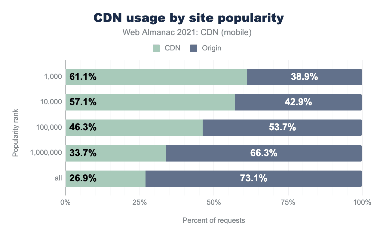 Webサイトのウェブ上での人気度に基づいてランキング(GoogleのChrome UX Reportから引用)し、CDNの利用状況を調べたところ、上位1,000位までのサイトはもっともCDNの利用率が、高いことがわかりました。上位のウェブサイトは、GoogleやAmazonのような大企業が所有しており、今日我々が目にするインターネットトラフィックの多くに貢献しています。したがって、これらの名前が次のセクションのトップCDNプロバイダーのリストに掲載されているのは当然のことなのです。これは、CDNが大規模に運用され、必要に応じてさらに拡張できる能力を持つことでもたらされる利点についての事実も裏付けています。