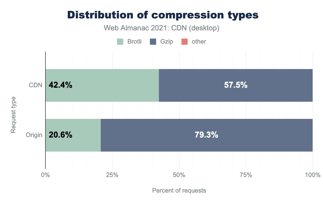 しかし、CDNでBrotli圧縮を使用するかどうかは、ウェブプロパティの所有者の裁量に任されています。全世界のウェブブラウザの95%がBrotli圧縮をサポートしているのに比べ、CDNを導入していてもBrotli形式で配信されているテキスト資産は全体の半分以下であり、この採用率は明らかに改善する余地があります。