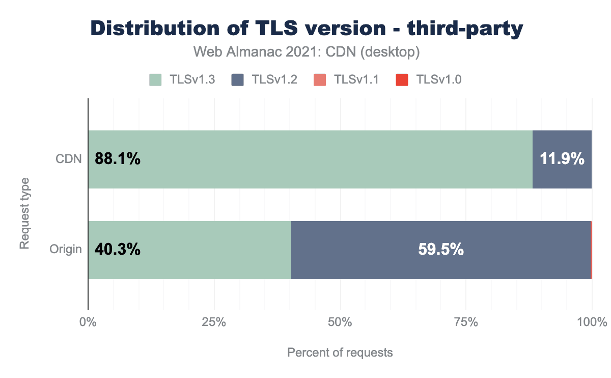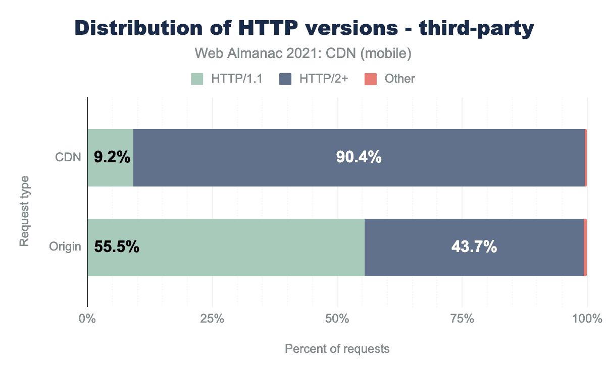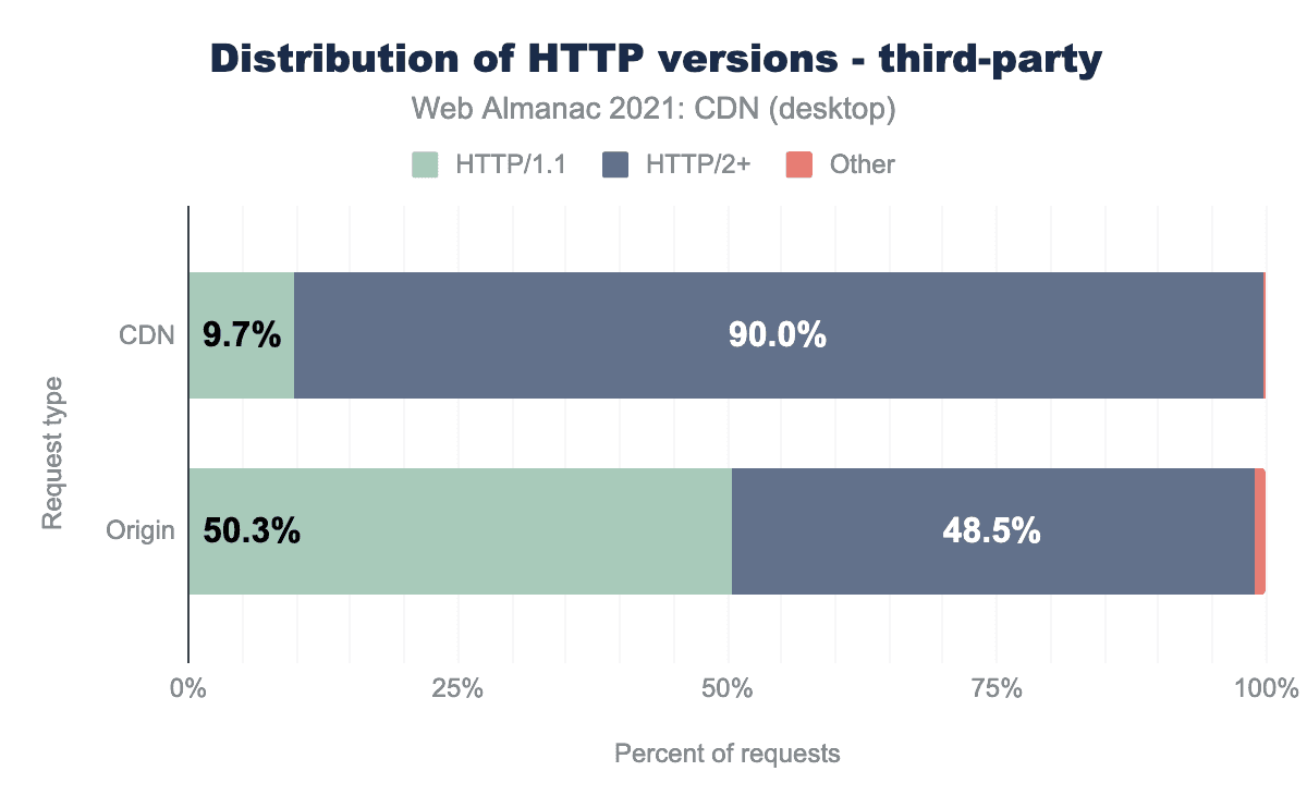 新しいプロトコルをサポートするサードパーティのドメインを見ると、ファーストパーティのドメインと比較して、HTTP/2+プロトコルの採用率が高いという興味深い傾向が見受けられます。これは、上位のサードパーティードメインのほとんどが専用のCDNを使用しているため、コンテンツの開発とコンテンツ配信をよりコントロールできるという事実を考慮すると、理にかなっていると言えます。さらにサードパーティードメインは、あらゆるネットワーク状況下で一貫したパフォーマンスを発揮する必要があり、そこでHTTP/2+は、従来のTCP接続に加えてUDP(HTTP/3で使用)などの他のプロトコルを混ぜることで価値を高めているのです。