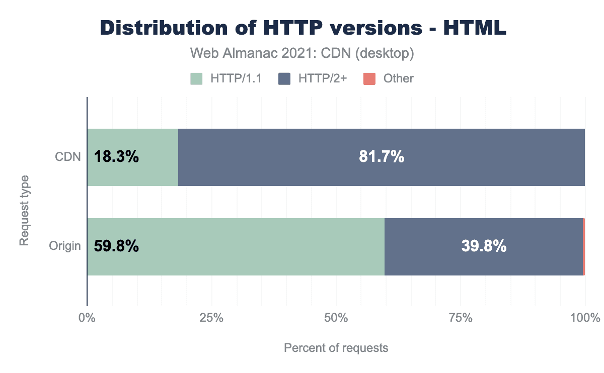 CDNを裏で動かしている秘密のソースを知ることは難しいため、外部からCDNについて推論できる洞察には限界があります。しかし、私たちはドメインをクロールし、CDNを利用しているものとそうでないものを比較しました。CDNは、ネットワーク層からアプリケーション層まで、Webサイトが新しいWebプロトコルを採用することを可能にするものであったことがわかります。