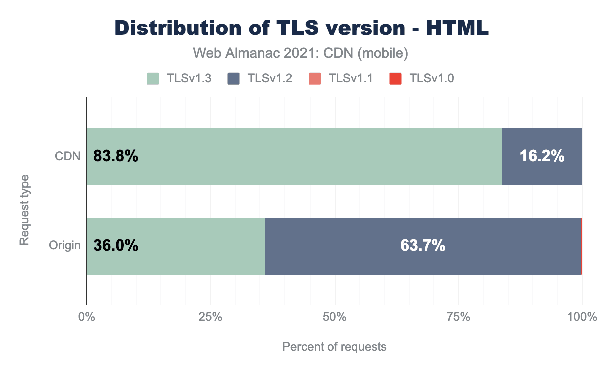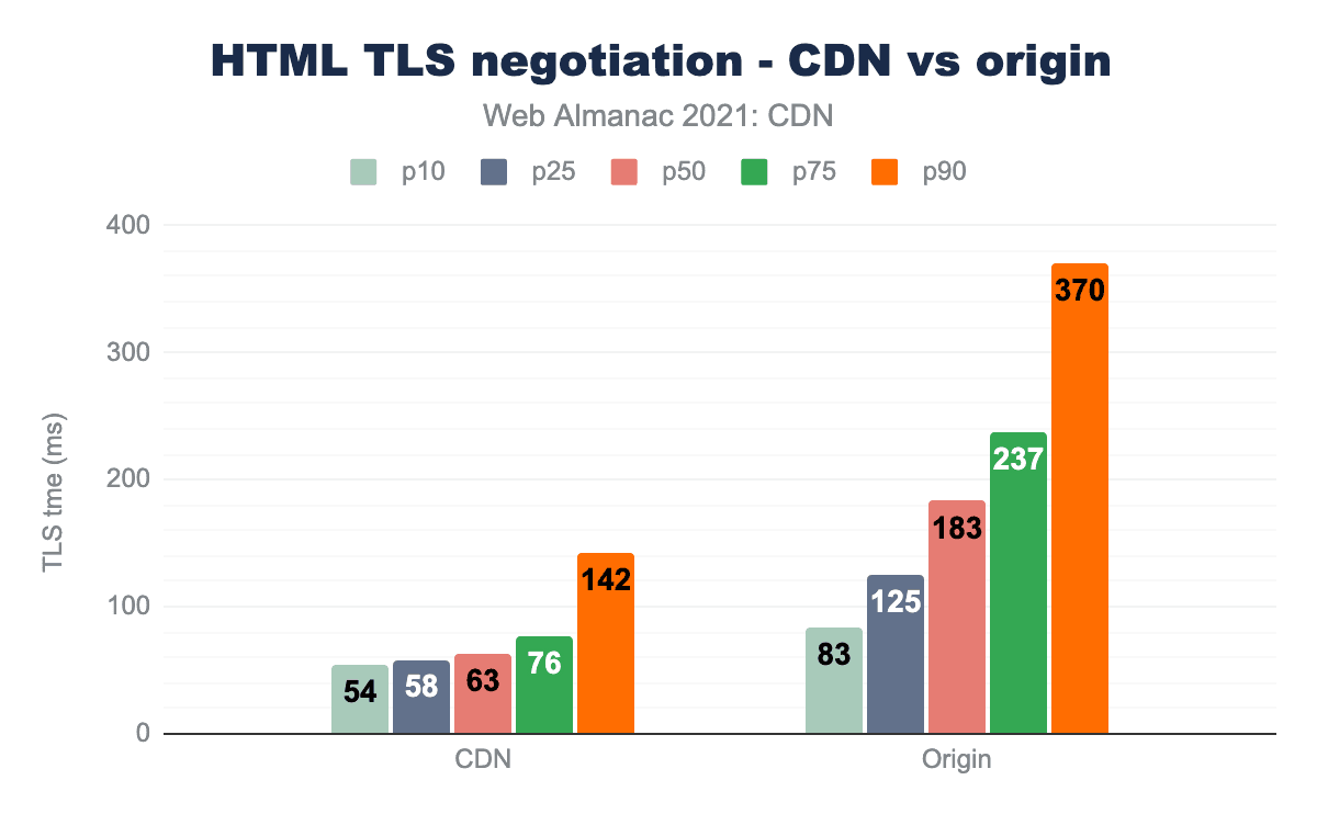 最近、すべてのサイトがTLSを使用しなければならないことを考えると、これは非常に重要です。このレイヤーでの最適なパフォーマンスは、TLS接続に続く他のステップに不可欠です。この点で、CDNは直接オリジン接続と比較して、より多くのユーザーを低いパーセンタイルブラケットに移動させることが可能です。