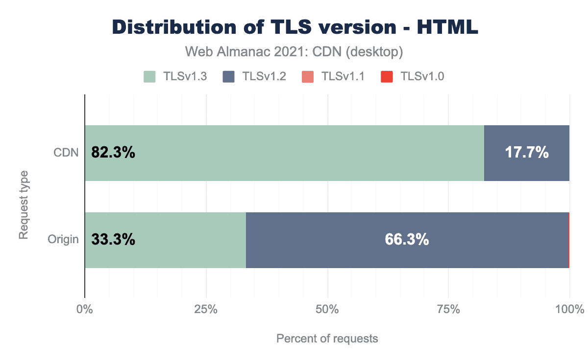 上のデータを見ると、オリジンでは33-36%であるのに対し、CDNでは83%のウェブサイトがTLS 1.3を使用していることがわかります。これは、CDNを利用する大きなメリットです。また、これらのプロトコルのアップグレードは、ウェブオーナーにとって最小限の労力で行うことができます。この傾向は、モバイルおよびデスクトップのWebサイトでも同じです。