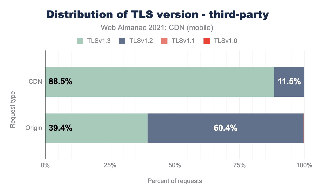 サードパーティのドメインは、セキュリティ上の理由から、最新のTLSバージョンであることが重要です。ウェブ攻撃の増加に伴い、ウェブ所有者はサードパーティドメインへの安全でない接続で悪用される可能性のある抜け穴に気づいています。そのため、Webサイトのセキュリティとパフォーマンスの要件を満たす、安全なTLS接続を期待するようになります。このような期待から、CDNがもたらすメリットはますます大きくなっています。