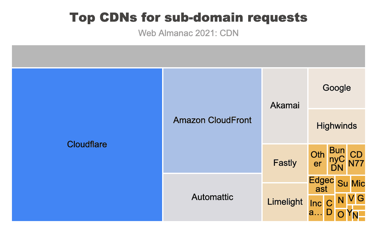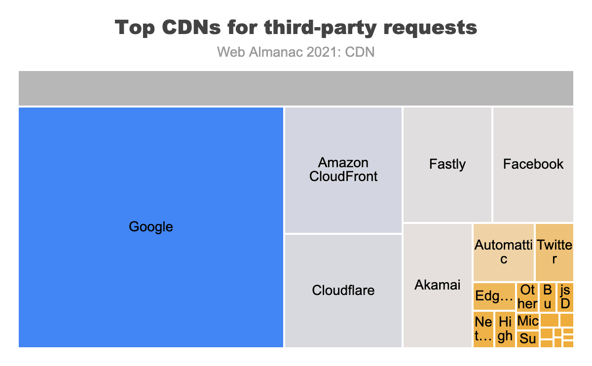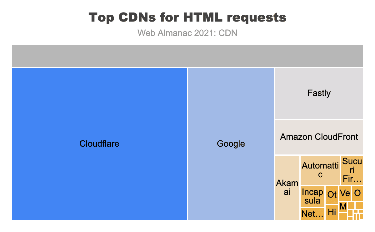 観察研究と同様、測定可能な範囲と影響には限界があります。Web Almanacのために収集したCDNの使用に関する統計は、使用中の適用可能なテクノロジーに重点を置いており、特定のCDNベンダーのパフォーマンスや有効性を測定することを意図したものではありません。このため、どのCDNベンダーにも偏ることはありませんが、より一般的な結果であることを意味します。
