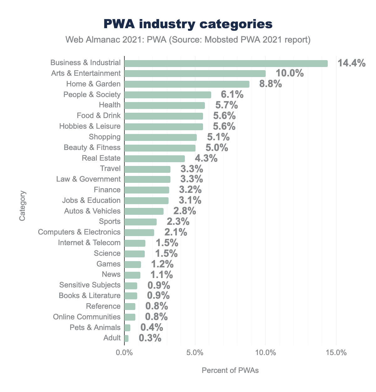 PWAを使用しているカテゴリーや産業に関するデータがないため、外部の情報源に頼っています。Mobstedは最近、独自のPWAの利用状況に関する分析を発表し、業界別のPWAの割合などを分析しています。