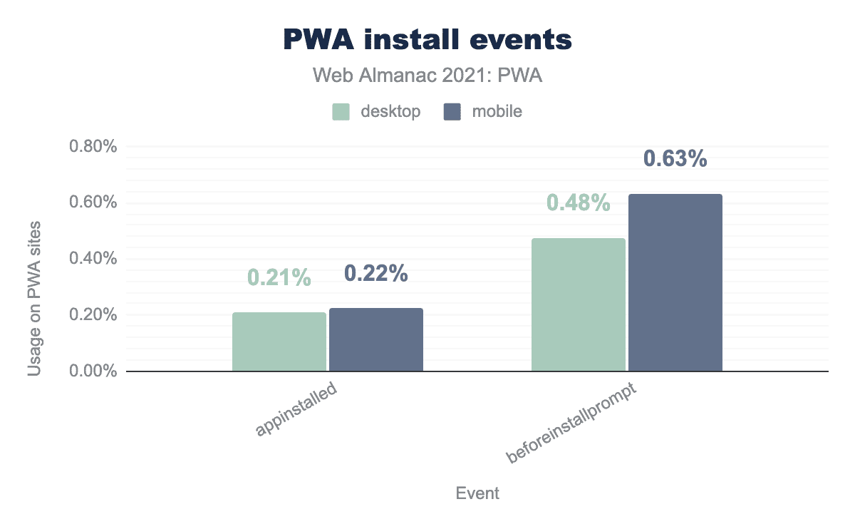 appinstalled はデスクトップの0.21% とモバイルの0.22% で使用されており、beforeinstallprompt はデスクトップの0.48%とモバイルの0.63%で使用されています。BeforeInstallPromptEventAPIは すべてのブラウザーでまだ利用できませんので使用率が、比較的低いことが説明されます。それでは、これが示すトラフィックの割合を見てみましょう。