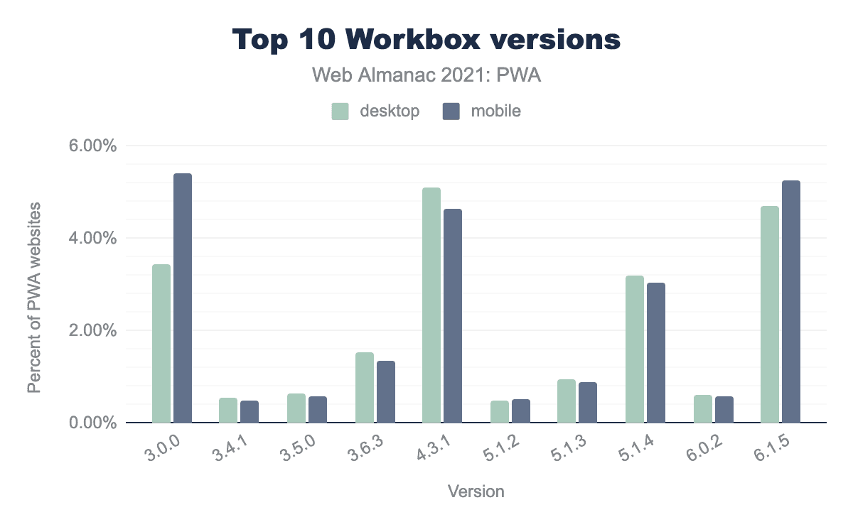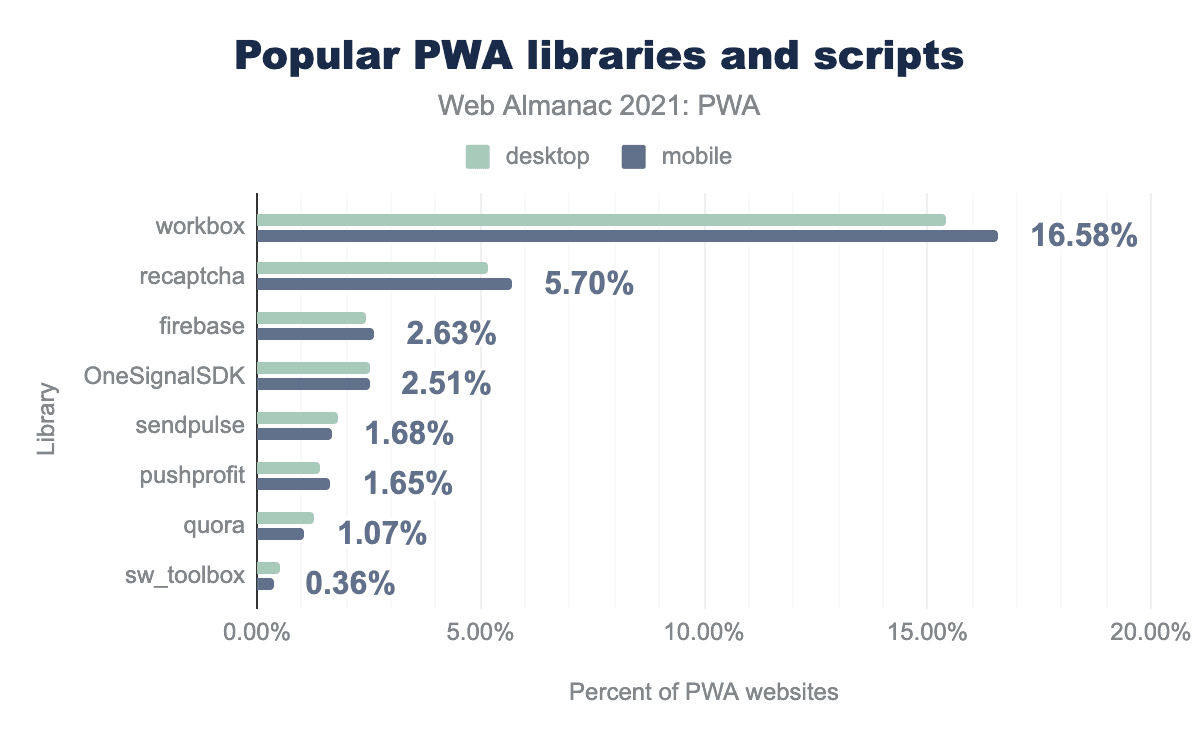 また、Workboxの前身であるsw_toolboxは、 昨年の使用率がデスクトップで13.92%、モバイルで12.84%でしたが、今年はそれぞれ0.51%と0.36%に低下しているのも重要な点です。これは、sw_toolboxが2019年に非推奨となったことが一因であると考えられます。人気のあるフレームワークやビルドツールの中には、このパッケージを削除するのに時間がかかったものもあるかもしれないので、今年はより明確に採用数の減少が見て取れます。また2020年と比較して、サイトを増やすなどして測定方法が変わったため、この指標はさらに減少し、直接の前年比は難しくなっています。