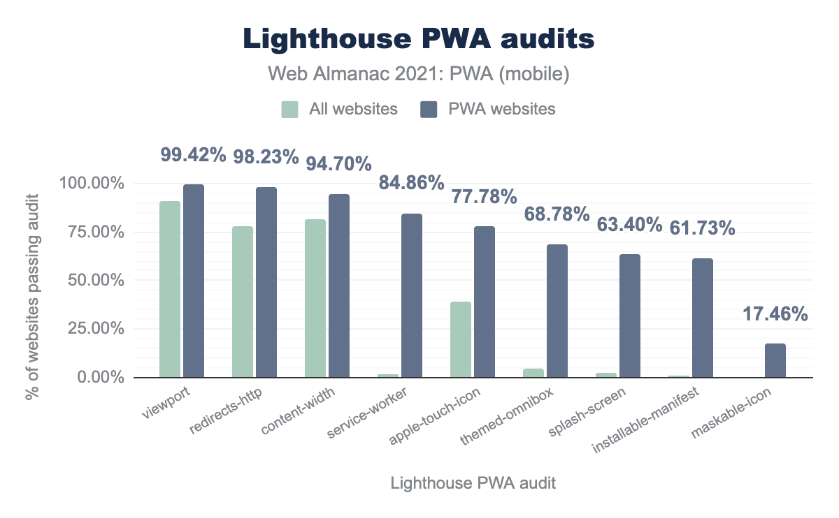 viewport監査は全サイトの91.16%、PWAサイトの99.42%、redirects-httpはそれぞれ78.01%、98.23%、content-widthが81.86%、94.70%、 service-workerでは1.50%、84.86%、 apple-touch-iconが39.25%と77.78%、 themed-omniboxが4.64%と68.78%、 splash-screenが2.28%と63.40%、 installable-manifestが1.08%と61.73%、 maskable-iconが0.38%と17.46%であることがわかりました。予想通り、この表からPWAとして特定したサイト群(サービスワーカーとマニフェストを持つサイト)は、Lighthouseの各PWA監査に合格する傾向が、あることがわかります。PWAに特化していない監査(たとえば、ビューポートの設定やHTTPからHTTPSへのリダイレクトなど)は、すべてのサイトで高いスコアを獲得していますがPWAに特化した監査では明確な違いがあり、これらは本当にPWAサイトによってのみ使用されています。