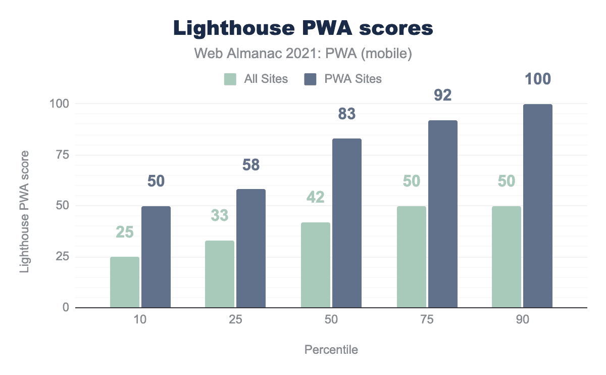 - グラフの下端を見ると、「PWAサイト」の90%がLighthouseのPWAスコア50以上を獲得しています(全サイトでは25)。