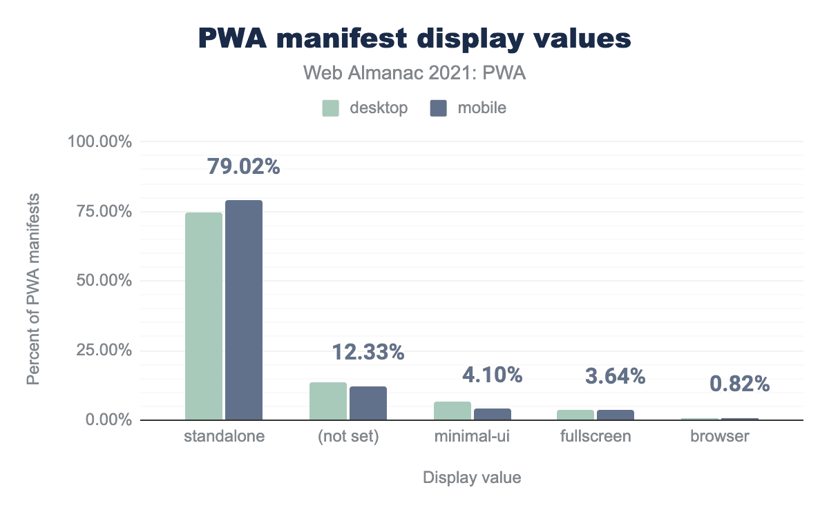 standaloneはデスクトップPWAページの74.83%、モバイルの79.02%、(未設定)はそれぞれ13.51%、12.33%、minimal-ui6.89%、4.10%、fullscreen3.74%、3.64%、最後に browserは0.92%と0.82% で使用されていることがわかります。displayプロパティは、開発者が好むウェブサイトのモードを決定する。 standaloneモードは、インストールされたPWAをブラウザのUI要素なしで開き、「アプリのように感じる」ようにするものです。このグラフは、サービスワーカーとマニフェストを持つほとんどのサイトがこの値を使用していることを示しています。デスクトップで74.83%、モバイルでは79.02%です。