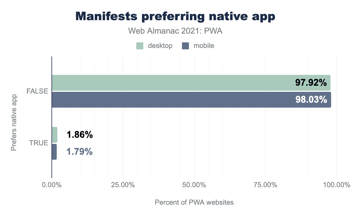 falseに設定されており、trueに設定されているのはデスクトップページの1.86%、モバイルページの1.79%のみです。prefer_related_applicationsは、デスクトップサイトの6.87%、モバイルサイトの7.66%にのみ表示されます。このグラフから、このプロパティを定義したデスクトップサイトの97.92%とモバイルサイトの93.03%がfalseという値を持っていることがわかります。これは、ほとんどのPWA開発者が、ネイティブアプリよりもPWAを提供することを好んでいることを示しています。