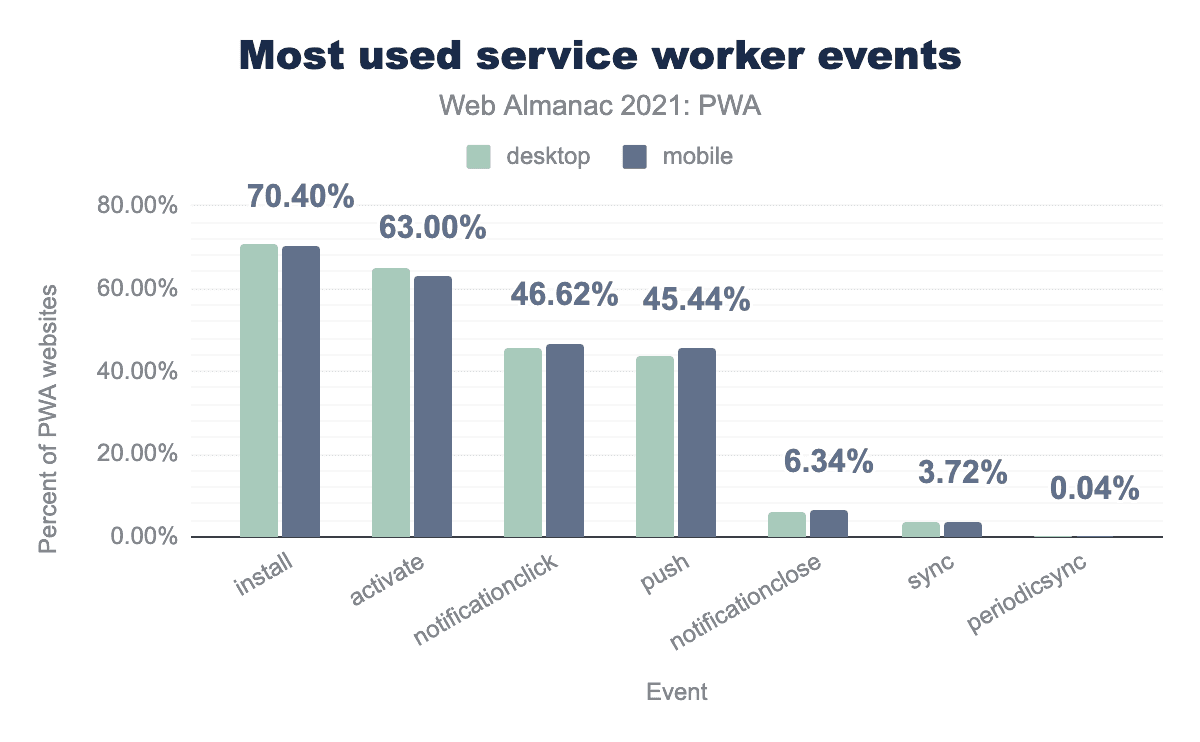 install が70.73%のPWAページで使用され、 activate が64.85%、 notificationclick が45.62%、 push が43.88%、 notificationclose が5.98%、 sync が3.75%、 periodicsync が0.04% であった。モバイルでは、installが70.40%、activate63.00%、notificationclick46.62%、push45.44%、notificationclose6.34%、sync3.72%、そして periodicsync0.04% のPWAページで使用されています。これらのイベント結果は、3つのサブカテゴリーに分類できます。