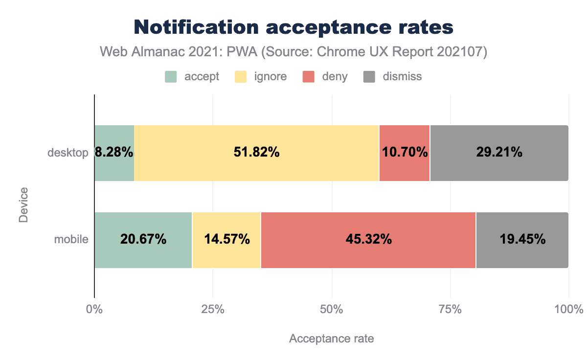 許可が8.28%、無視 51.82%、拒否 10.70%、却下 29.21%となっています。モバイルでは、許可が20.67%、無視 14.57%、拒否 45.32%、却下 19.45%となっています。モバイルはデスクトップよりも高い承諾率(20.67%対8.28%)を示しています。これは、ユーザーがモバイルの通知をより有用と感じる傾向があることを示唆しています。これには、2つの理由があると考えられます。(1) ユーザーはデスクトップよりも携帯電話の通知に慣れており、モバイルコンテキストでの通知の有用性がより明白であること、 (2) 通知プロンプトのモバイルUIは通常より顕著であることです。