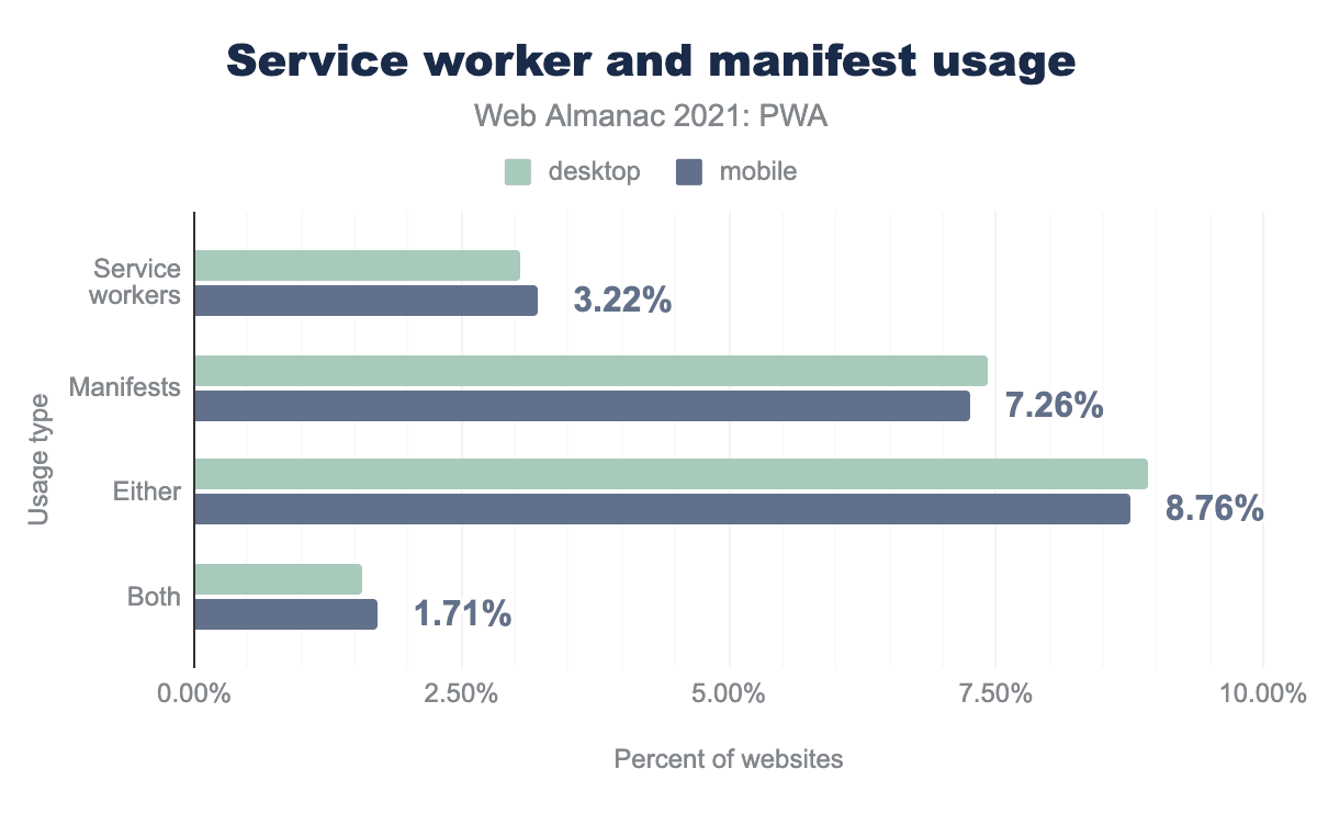 上の図では、デスクトップ サイトの1.57%とモバイルサイトの1.71%がサービス ワーカーとマニフェストの両方を備えていることがわかります。これは、「インストール可能な」Webサイトの潜在的な割合の第一近似値です。