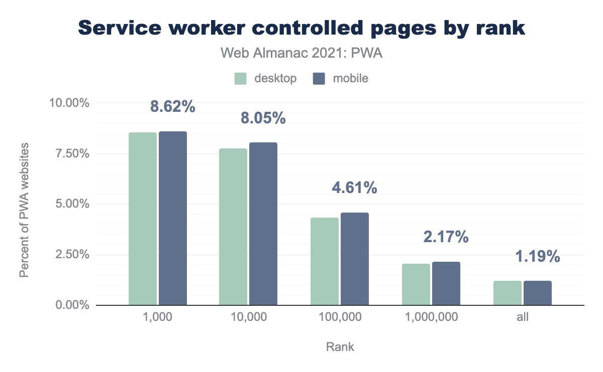 2021年には、測定方法にもよりますが、1.22%から3.22%のサイトがサービスワーカーを使用していると推測されます。今年は、次に説明する理由から、3.22%にもっとも近い値を採用することにしました。