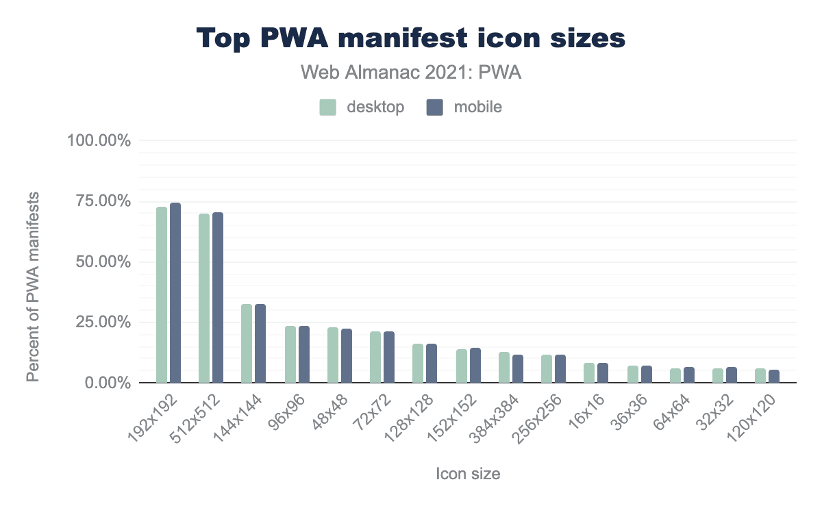 192x192 がデスクトップPWAサイトの72.58%、モバイルの74.20%、512x512が70.09%と60.36、144x144で32.76%と32.59%、96x96が23.73%と23%、48x48が23.10%と22%、72x72が21.03%と21%、128x128が16.19%と16.30% 、152x152は14.11%と14.52%、384x384は12.93%と11.84%、256x256は11.73%と11.86%、16x16は8.10%と8.32%、36x36は7.36%と7.01%、64x64は6.18%と6.38%、32x32は6.05%と6.37%、そして最後に120x120は6.14%と5.61%であった。圧倒的に人気のあるアイコンサイズは、以下の通りです。192x192と512x512は、Lighthouseが推奨するサイズです。実際には、開発者もさまざまなサイズを用意し、さまざまなデバイスの画面で見栄えがよくなるようにしています。