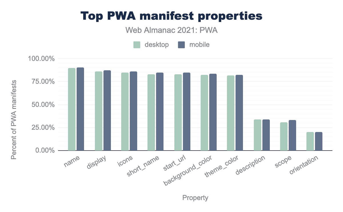 nameまたはshort_nameです。nameプロパティは90%のサイトに存在し、short_nameはデスクトップとモバイルのサイトのそれぞれ83.08%と84.69%に表示されています。これらのプロパティの使用率が高いのは、どちらも重要な属性であるためです。nameはユーザーのホーム画面に表示されますが、長すぎたり画面内のスペースが小さすぎたりすると、代わりにshort_nameを表示することがあります。iconです。このプロパティは、デスクトップサイトの84.69%、モバイルサイトの86.11%に表示されています。アイコンは、ホーム画面、OSのタスクスイッチャーなど、さまざまな場所で使用されています。このことからも、その採用率の高さがうかがえます。start_url。このプロパティは、デスクトップサイトの82.84%、モバイルサイトの84.66%に存在します。これは、ユーザーがウェブアプリケーションを起動したときに、どのURLが開かれるかを示すもので、PWAにとってもう1つの重要なプロパティです。displayです。このプロパティは、デスクトップサイトの86.49%およびモバイルサイトの87.67%で宣言されています。これは、ウェブサイトの表示モードを示すために使用されます。表示されていない場合、デフォルト値はbrowserで、これは従来のブラウザのタブであるため、ほとんどのPWAはこれを宣言して、代わりにstandaloneモードで開くべきであると示しています。スタンドアローンモードで開く機能は、「アプリらしい」体験を生み出すのに役立つものの1つです。prefer_related_applicationsです。このプロパティはデスクトップサイトの6.87%、モバイルサイトの7.66%で表示されますが、このリストの他のプロパティと比較すると低い割合のように思われます。この理由は、Lighthouseがこのプロパティの存在を必須としておらず、trueという値で設定することを推奨しているに過ぎないからです。