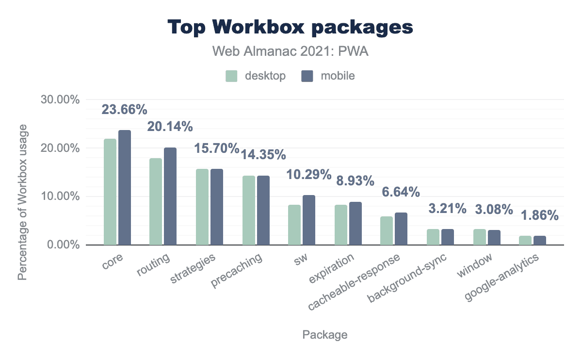 coreが21.96%、モバイルでは23.66%、routingは17.88%と20.14%、strategiesは15.82%と15.70%、precachingは14.41%と14.35%、swは8.38%と10.29%、expirationは8.30%と8.93% 、cacheable-responseが5.87%と6.64%、background-syncが3.27%と3.21%、windowが3.36%と3.08%、最後にgoogle-analyticsが1.91%と1.86% であった。上のグラフから、次の4つのパッケージがもっとも多く使われていることがわかります。